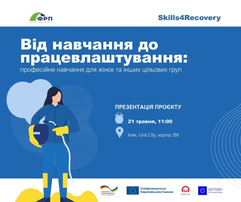Проєкт «Від навчання до працевлаштування: професійне навчання для жінок та інших цільових груп» впроваджується Фондом розвитку підприємництва за фінансової підтримки Європейського Союзу, Німеччини, Польщі та Естонії в межах Мультидонорської ініціативи Skills4Recovery, яка реалізується Deutsche Gesellschaft für Internationale Zusammenarbeit (GIZ) GmbH та Solidarity Fund PL (SFPL).