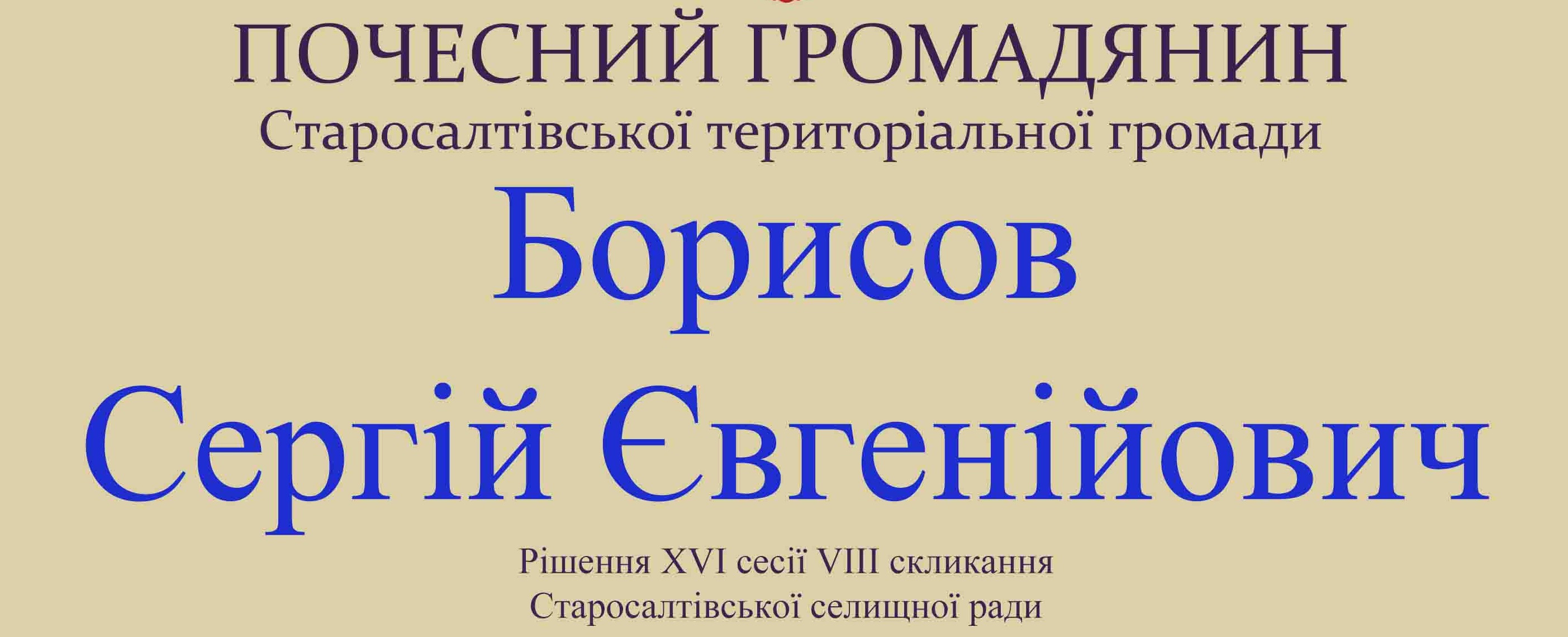 Рішенням ХVI сесії VIII скликання Старосалтівської селищної ради від 31 серпня 2021 року Борисову Сергію Євгенійовичу присвоєно звання «Почесний громадянин Старосалтівської територіальної громади 2021року».