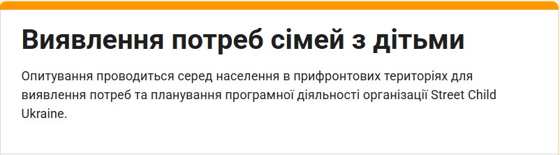 Опитування проводиться серед населення в прифронтових територіях для виявлення потреб та планування програмної діяльності організації Street Child Ukraine.